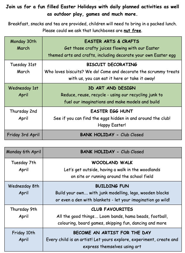 The Club will be open for the Easter holidays in 2026.